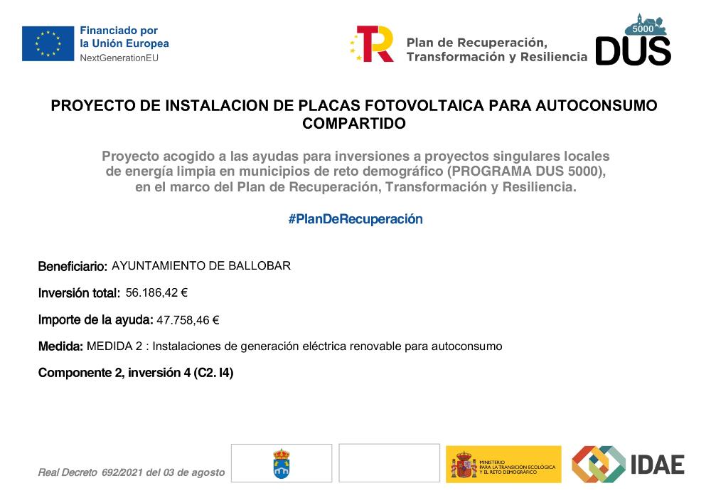 INSTALACIÓN DE PLACAS FOTOVOLTAICAS DE 43,20 KWP DE POTENCIA PARA AUTOCONSUMO COMPARTIDO CON EXCEDENTES ACOGIDOS A COMPENSACIÓN. Whatsapp: INSTALACIÓN DE PLACAS FOTOVOLTAICAS DE 43,20 KWP DE POTENCIA PARA AUTOCONSUMO COMPARTIDO CON EXCEDENTES ACOGIDOS A COMPENSACIÓN. Fecha 16 diciembre 2024 Documentos NOTA DE PRENSA_Ballobar DUS 5000.pdf (pdf 240,7 kB) Galería imágenes